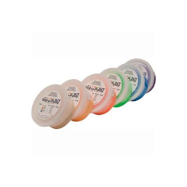 Val-u-putty exercise putty, 2 ounce, set of 6 (6 colors) val-u-putty has the same great feel as the traditional cando theraputty hand exercise material. Available in 6 resistance levels. Val-u-putty is available in berry colors. Each color-coded putty has a different consistency ranging from xx-light for strengthening the weakest grasp to x-heavy for developing a stronger grip. The putty material is gluten, casein and latex free. 6 piece set - 2 oz.
