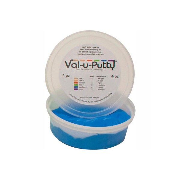 Val-u-putty exercise putty, blueberry, firm, 4 ounce val-u-putty has the same great feel as the traditional cando theraputty hand exercise material. Available in 6 resistance levels. Val-u-putty is available in berry colors. Each color-coded putty has a different consistency ranging from xx-light for strengthening the weakest grasp to x-heavy for developing a stronger grip. The putty material is gluten, casein and latex free. Blueberry, firm, 4 oz.