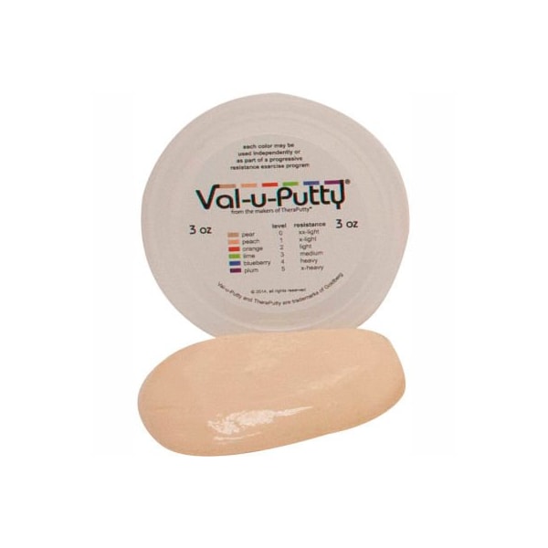 Val-u-putty exercise putty, pear, xx-soft, 3 ounce val-u-putty has the same great feel as the traditional cando theraputty hand exercise material. Available in 6 resistance levels. Val-u-putty is available in berry colors. Each color-coded putty has a different consistency ranging from xx-light for strengthening the weakest grasp to x-heavy for developing a stronger grip. The putty material is gluten, casein and latex free. Pear, xx-soft - 3 oz.