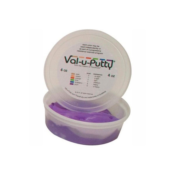 Val-u-putty exercise putty, plum, x-firm, 4 ounce val-u-putty has the same great feel as the traditional cando theraputty hand exercise material. Available in 6 resistance levels. Val-u-putty is available in berry colors. Each color-coded putty has a different consistency ranging from xx-light for strengthening the weakest grasp to x-heavy for developing a stronger grip. The putty material is gluten, casein and latex free. Plum, x-firm - 4 oz.