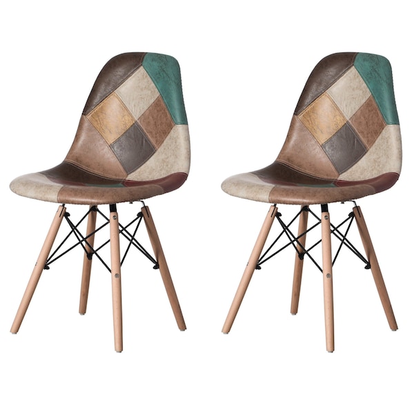 Modern Fabric Patchwork Chair w/Leather and Suede Like Tones w/Wooden Legs, PK 2