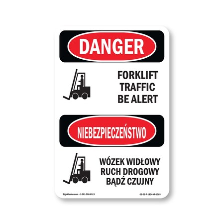 OSHA Danger Sign, 24" Height, Rigid Plastic, Forklift Traffic Be Alert Bilingual, 1824-VP-1265