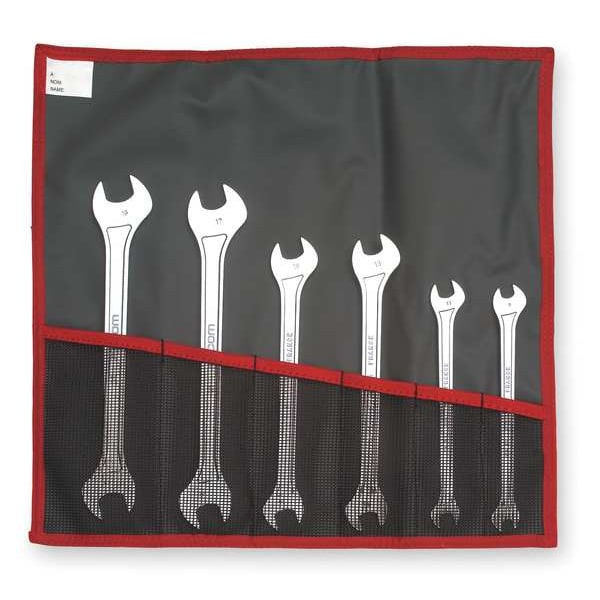 Open End Wrench Set, Alloy Steel, Satin, Number of Tools 6, Range of Head Sizes 8 mm to 19 mm, 15 Degrees , Insulated Yes, Canvas Pouch, Metric, Double End, Rounded, One Piece, 6 7/8 in to 9 27/32 in