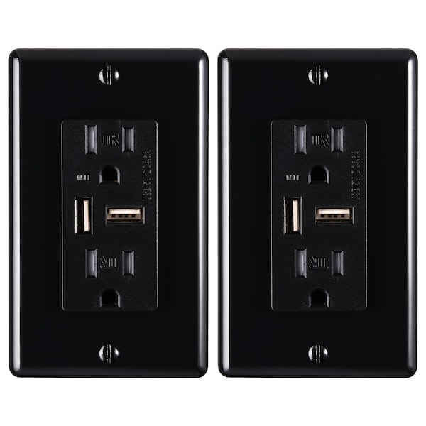 4.6A USB Outlet and 15A Decorator Tamper-Resistant Duplex Receptacle with Wall Plate, Black, 2PK
