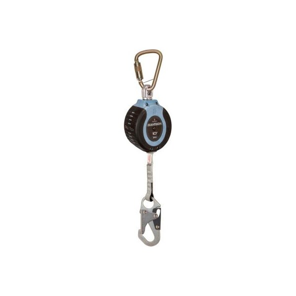 Falltech 82710sc1 duratech 10' compact web srd, with steel carabiner and steel snap hook features: 10' compact web srd; single-leg steel carabiner with captive pin steel snap hook leg-end connector compact and durable with a fast-activating internal inertial brake system. Integral swivel-eye reduces twisting of abrasion-resistant webbing. Impact-resistant over-molded side walls and glass-reinforced polycarbonate housing