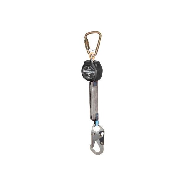 Falltech 72706sb1 duratech 6' mini srd single-leg, steel carabiner & steel snap hook available as a single unit, or as a twin, the duratech 6' mini srd allows attachment from overhead to 5' below the dorsal d-ring - outperforming traditional shock absorbing lanyards. Customizable, with multiple steel and aluminum leg-end and swivel-eye connector options, you can build your srd for the way you work. features: swivel-eye for reduced lifeline leg twisting durable compact and impact resistant nylon housing internal locking pawls provide quick and positive stopping action integral shock absorber also provides visual fall event indication after deceleration abrasion resistant dyneema lifeline webbing provides longer service life