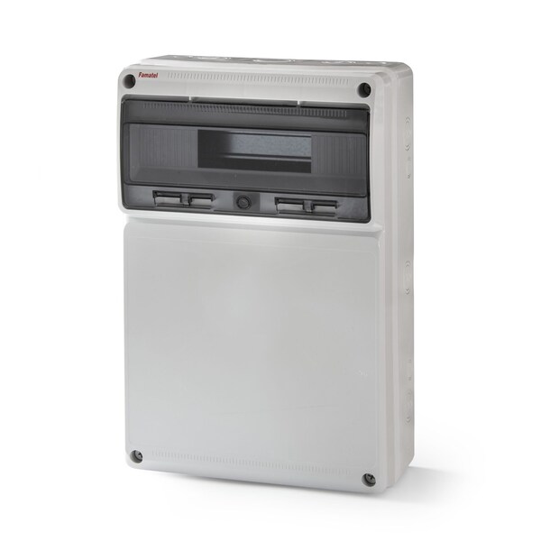 IP65 Surface mounted blind enclosure with preinstalled DIN rail and transparent window. Dimensions 21.6 in H, 13 in W, 6 in D. 16 modules and punchouts on each side. Body in ABS and window in Polycarbonate.