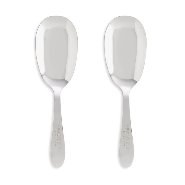 Fantes Mama Mariella's Pasta Serving Spoon scoops and serves generous amounts of pasta and sauce Made from 18/8 stainless steel; complements any decor; set of 2; each measures 10 x 2.75-inches Shallow bowl serves ravioli, gnocchi, tortellini, penne, ziti, agnolotti, and other delicate pastas without breaking them apart Flat back spreads sauces for layering lasagna and making pizza Short handle allows precise control over portions for serving everyday meals and entertaining on special occasions; dishwasher safe for easy cleanup