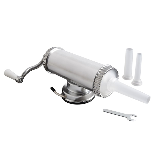 Fantes Uncle Attilio's Sausage Maker for easily creating homemade sausage recipes and controlling fat levels and content quality for tastier results Made from aluminum and plastic; suction base secures to any nonporous surface; measures 16.5 x 4 x 8-inches; holds up to 2.2 pounds Create thin, regular and plump links with 3 nozzle sizes 15, 19, and 22-millimeter diameter; customize flavor and meat combinations Fill canister with sausage meat, slide casing onto the nozzle and turn handle to fill; guide casing by hand to prevent breakage; tie at desired length Suction base and crank handle for easy use; includes instructions and Fantes family recipe; disassembles for cleaning; hand wash in warm, soapy water