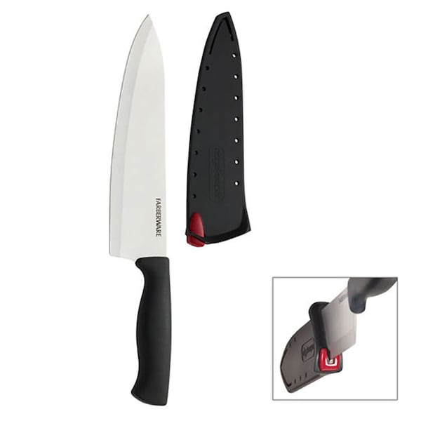 This Farberware Edge KeeperTM 8 Inch Chef Knife with Sheath is an ideal way to have a sharp cutting tool at hand at all times. The unique design of the Edgekeeper sheath has a built-in knife sharpener that creates a sharp blade every time the knife is inserted or removed. The sheath also keeps the knife protected while in storage. Hand wash with warm water and a mild detergent; rinse and dry immediately.