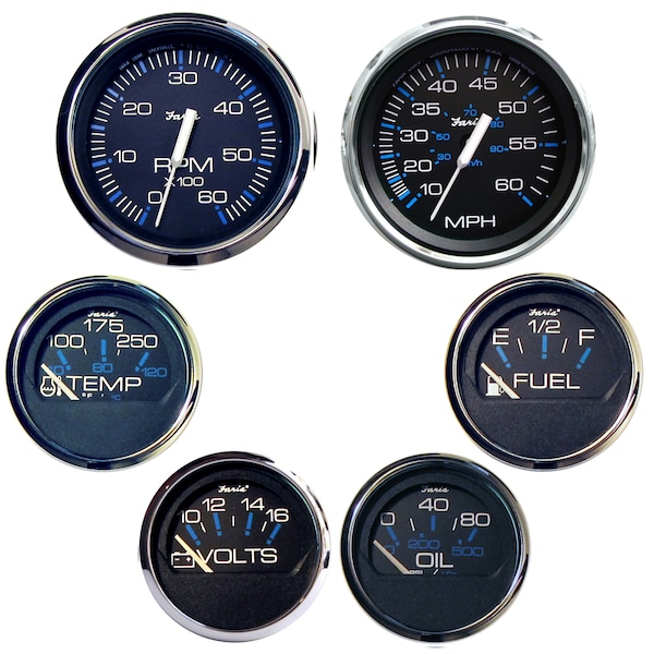 Chesapeake Black SS Boxed Set - Inboard Motors Packaged and ready for the display counter. These 6 Gauge Boxed Sets offer a complete set of gauges ready to install. Inboard Motors Boxed Set Includes Speedometer (60 MPH) (Mechanical) Tachometer (6000 RPM) Fuel Level Voltmeter (10-16 VDC) Water Temp (100-250 F) Oil PSI (80 PSI)
