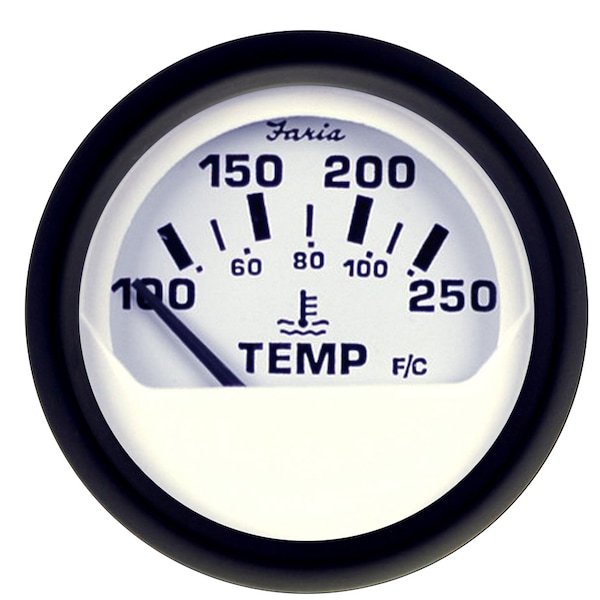 Euro White 2" Water Temperature Gauge (100-250 F) 2" - Hole Size: 2.0625" (53mm) A temperature gauge operates by sending a low amperage current through the gauges's meter to ground via a sending unit with variable resistance. The resistance of the sending units increase or decrease with the changes in pressure, temperature, etc... As the sender's resistance varies, the amount of current allowed to flow through it to ground changes and the meter deflects, showing the temperature. Available for MG systems, J1939 CAN Bus or J1939 Stand-Alone systems and mechanical types. Benefits: Standard (100-250 F) Metric (40-120 C) Dual Scale With or without Lights