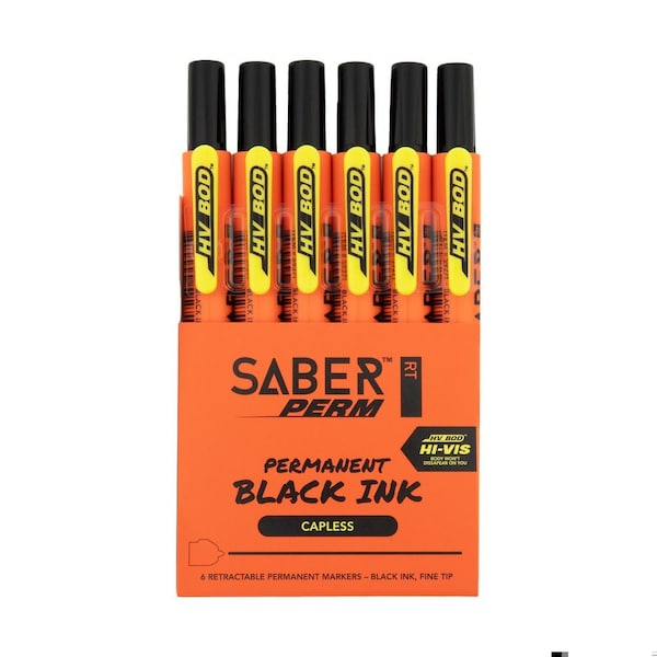 Faro SaberPerm RT Permanent Ink Marker Retractable Hi-Vis Body Black Ink Fine Tip, 6PK