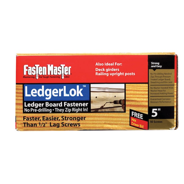 LedgerLoks are the first wood screws engineered to fasten a deck ledger board to the rim joist of a house with no predrilling. The hex-head version allows for greater bit engagement, reducing cam-out. The Flat Head style, with TORX ttap drive system, provides flush to ledger installation saving additional time and money. LedgerLOK replaces lag screws and through-bolts, has been coated with a proprietary three-step coating process that protects against corrosion (even in pressure treated wood) and is ACQ approved.