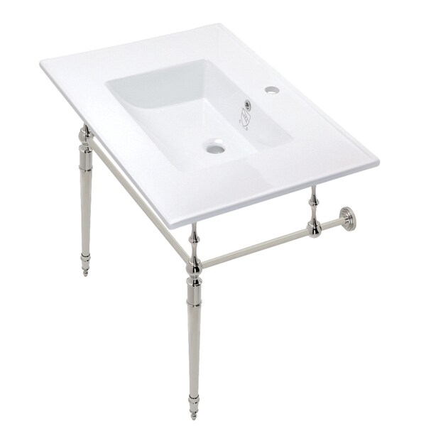 With a beautiful ceramic counter top, this console sink set is a long lasting, durable, and elegant addition to your bathroom. The console sink basin comes with single faucet hole and rear overflow. A fabulous alternative where space is limited or tight, these sinks are also known for their wheel-chair accessibility, making them friendly for the whole family. The pristine, stain-resistant surface and glistening finish make for a very sturdy fixture that is easily maintained. Also for your convenience, anti-slip rubber pads are included with the brass legs to ensure steadiness. Water supply kit, drain assembly, and the faucet are sold separately.