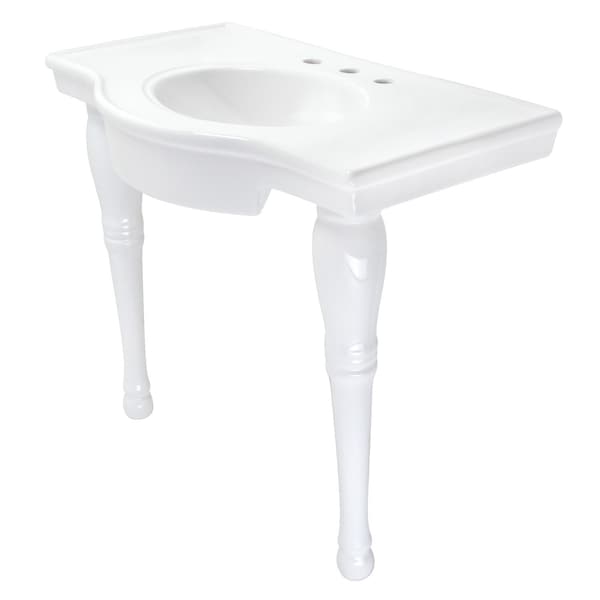 From Kingston Brass, this basin console with pedestal was designed with a striking design that will make almost any interior stand out. Constructed from solid ceramic, appreciate the finished glow that the console gives off. Installation of the console is on two legs and is mounted on the wall of the interior room. The console comes with a generous bowl size, while the overall console dimensions are (L) 37-3/8 inch x (W) 21-5/8 inch x (H) 31-7/8 inch and is included with pre-drilled holes perfect for a 3-hole faucet install. The console's smooth texture allows for easy-to-clean and easy-to-manage maintenance. The console is also finished with a sleek white color that brings out the texture and the design of the ceramic material.
