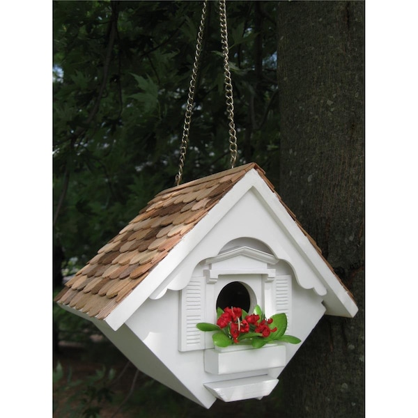 This hanging house is designed to accommodate house wrens. Topped with western red cedar this charming little cottage has a window box frame and planter with decorative flowers removable for outdoor use. Fully functional house has a bottom panel that can be easily removed for yearly cleaning. Sturdy brass chain. Item Dimensions: 8 H x 6.5 W x 5.5 D