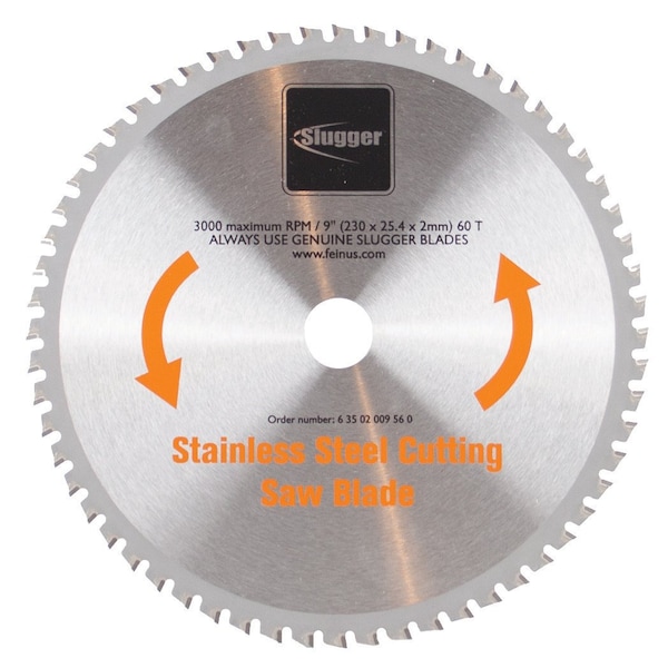 Circular Saw Blade, Blade Dia. 9 in, Max. Blade Speed 3,380 RPM, Arbor Size 1 in, Arbor Shape Round, Diamond Knockout Diamond Knockout Not Included, Number of Teeth 60, Max. Cutting Depth 3 1/4 in, Primary Material Application Stainless Steel, Materials Cut Stainless Steel, Metal Cutting Type Thin Metal, Wood Cutting Type Not Applicable, Cut Width 0.08 in, Tip Material Carbide, Hook Angle 10 Degrees , Tooth Grind ATB, For Use With Saw Type Circular Saws, Blade Type Stainless Steel Cutting