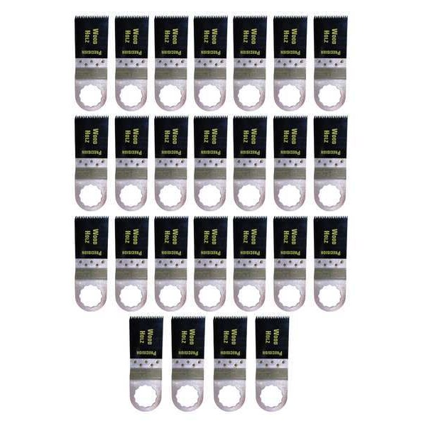 Oscillating Tool Blade, Blade Type Flush Cutting, Precision Cutting, Connection Style 12-Point, Blade Shape Straight, Blade Width 1 3/8 in, Blade Length 2 in, Overall Length 2 in, Maximum Oscillations per Minute 19,500, Primary Material Application Wood, Materials Cut Wood, Cut Style Straight Cut, Cutting Edge Style Toothed, Direct Fit For Tool Brand Fein Multimaster Series, Number of Pieces 25, Package Quantity 25