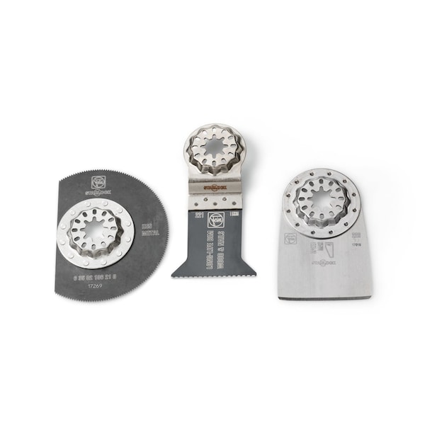 Oscillating Tool Blade Set, Blade Type Scraping, Straight Cutting, Connection Style Starlock, Blade Shape Semi-Circular, Straight, Blade Material Bi-Metal, Blade Diameter 3 3/8 in, Blade Width 7/8 in, 2 in, Blade Length 7/8 in, 1 1/2 in, 1 5/8 in, Overall Length 7/8 in, 1 1/2 in, 1 5/8 in, Maximum Oscillations per Minute 19,500, Primary Material Application Metal, Wood, Materials Cut Metal, Wood, Cut Style Flush Cut, Plunge Cut, Straight Cut, Cutting Edge Style Continuous, Toothed