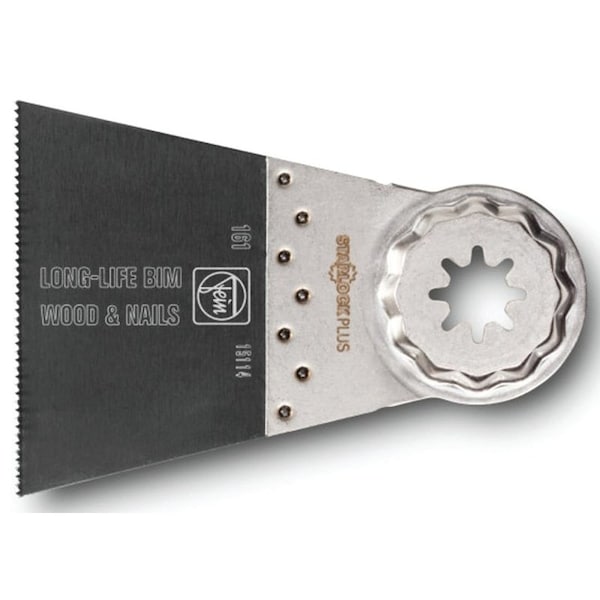 Bi-metal with teeth set for all woods, plasterboard and plastic materials. Very clean cut and excellent work progress. Extremely robust, unaffected by nails in wood up to approximately 3/16 in Dia, masonry. 2-9/16 in W x 2 in L. Wide shape for maximum cutting performance and long straight cuts.