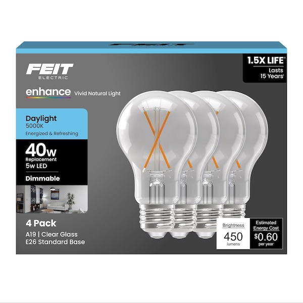 Feit Enhance A19 E26 (Medium) Filament LED Bulb Daylight 40 Watt Equivalence 4 pk