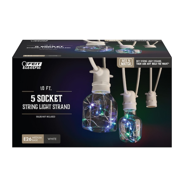 Create a unique look for your indoor and outdoor spaces with this decorative string light strand from Feit Electric. Choose your own bulbs with 5 full-sized sockets that can be used with any E26 medium base light bulb, up to 40 watts each (200-watt maximum). String together multiple sets using low-energy LED vintage or fairy bulbs and add an enchanting glow to any space. This durable strand is made from heavy-duty materials to withstand outdoor conditions. Simple to install and versatile, the sets easily connect end-to-end to extend the length and plug into a regular wall outlet.