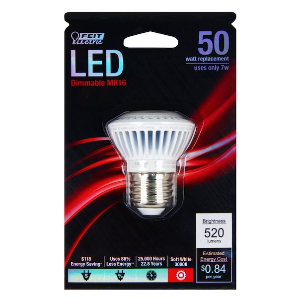 Enjoy all the benefits of advanced LED energy-saving technology with the Feit Electric 50W MR16 LED light bulb. This 3000K soft white light is dimmable and will replace a 50-watt equivalent incandescent bulb. Get instant on to full brightness with relatively cool running performance. Feit Electric MR16 bulbs have an average life of 25,000 hours / 22.8 years are RoHS compliant.