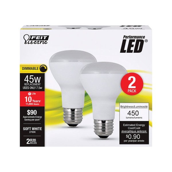 Enjoy all the benefits of advanced LED energy-saving technology with the Feit Electric R20DM/10KLED/2 2-pack R20 45W LED light bulbs. This 2700K soft white light is dimmable and will replace a 45-watt equivalent incandescent bulb. It produces a similar light output (450 lumens) and uses 7.5 watts of electricity and up to 83% less energy than a standard incandescent light bulb. Get instant on to full brightness with relatively cool running performance. Feit Electric R20 bulbs have an average life of 11,000 hours / 10 years, are RoHS compliant and 100% mercury free. Choose a dependable general purpose track and recessed lighting bulb for residential or commercial applications.