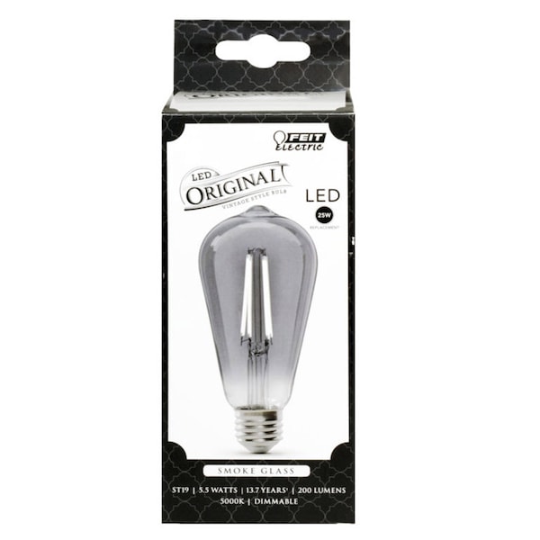 Enjoy all the benefits of advanced LED energy-saving technology with the dimmable Feit Electric ST19 5.5W The Original Vintage LED smoke glass light bulb. It produces a light output of 200 lumens and uses 5.5 watts of electricity. Get instant on to full brightness with relatively cool running performance. The Original Vintage LED light bulbs have an average life of 15,000 hours / 13.7 years are RoHS compliant. Choose a dependable decorative bulb for residential or commercial applications.