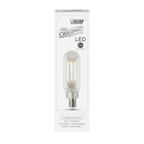 Turn home lighting into an expression with the beautiful glow of Feit Electric Original Vintage LED light bulbs. These dimmable T8 bulbs combine the latest energy-saving LED technology with a traditional filament design wrapped in a glass housing, adding an elegant, historic touch to any fixture. Their Soft White 2700K glow provides warm, inviting light ideal in bedrooms, living rooms, and dining areas. Place these bulbs in chandeliers and wall sconces with E12 sockets to give your home an ambiance previously only seen in high-end restaurants and hotels. T8C/CL/VG/CA/LED/4 LEDs use up to 91% less energy than equivalent 40-watt bulbs and are rated to last 15,000 hours. Their 90+ CRI makes skin tones appear more natural and colors more vibrant. Choose long-lasting Feit Electric Original Vintage LEDs for up to 13 years of even, high-quality light.