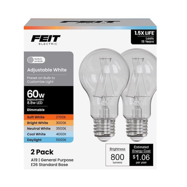 Feit A19 E26 Medium Filament LED Bulb Adjustable White 60 Watt Equivalence 2 pk