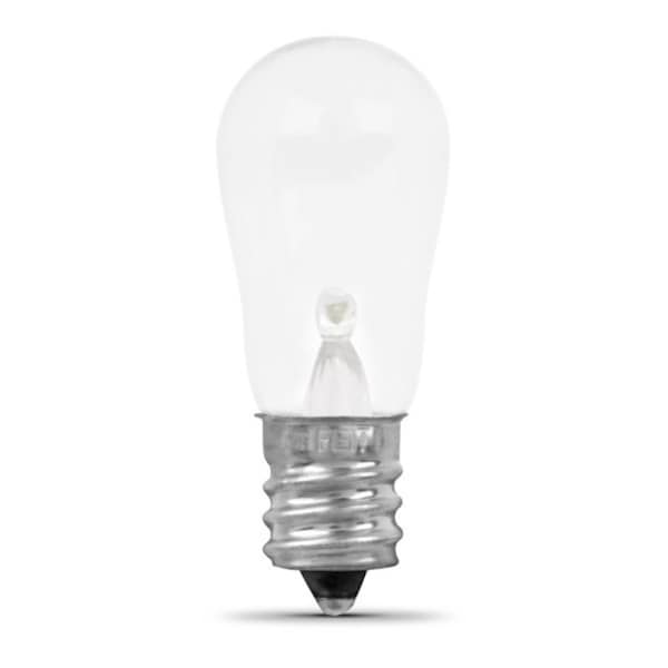 Feit Electric LED Light Bulb, Wattage Rating: 0.12 W, 120 V, Lamp Base: E12 Candelabra, Lamp Shape: S6, Lamp Finish: Clear, Lumens: 6 Lumens, Light Color: Soft White, Color Temperature: 2700 K, Color Rendering Index CRI: 80, Average Life: 15,000 hr, Dimensions: 3/4 in Dia x 1-7/8 in H, Incandescent Equivalent: 6 W, Suitable for: Indicator Lights