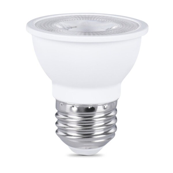 Medium base 7 watt, 120 volt, medium base dimmable Performance LED is a direct replacement for a 50 watt MR16. 520 lumen, 3000K. Average life of 25,000 hours. 42 degree beam spread. Instant on to full brightness, indoor, suitable for damp locations. RoHS and FCC Compliant and mercury free. 2.3H x 1.5''D.''