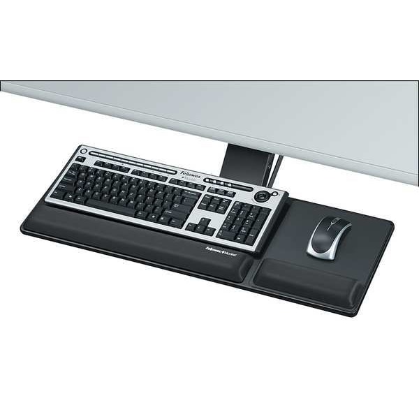Keyboard Tray, Overall Height 3 in, Overall Length 18 in, Overall Width 27 1/2 in, Color Black, Arm Style Glide Track, Material Fiberboard, For Use With Diagonal or Curved Edge Straight Workstations, Track Length 17 3/8 in, Swivel Angle 360 Degrees , Features Adjustable, Includes Mouse Tray, Wrist Support