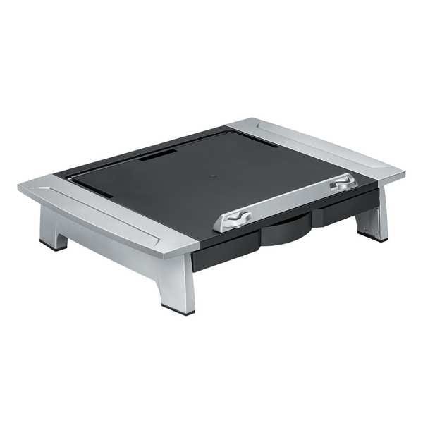 Monitor Stand, Product Type Monitor Stand, Overall Width 19 7/8 in, Overall Depth 14 in, Maximum Height 6 1/2 in, Minimum Height 4 in, Material HPS, Color Black, Silver, Weight Capacity 80 lb, For Use With Laptops up to 10 lb, Monitors up to 80 lb, Includes Document Holder, Storage Drawer