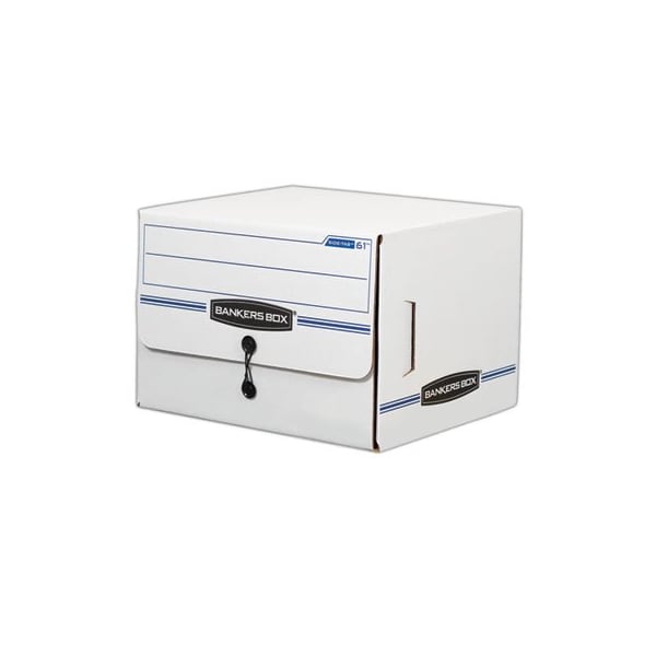 Drop-front lid provides easy access to end-tab patient files and medical records. Designed for shelf storage, these sturdy units stack two high. Center divider holds file folders upright for easy organization. String & button closure keeps files securely stored. Box Type: File Storage; Strength: Medium-Duty; File Size Format: Letter; Inner Width: 15.25in.