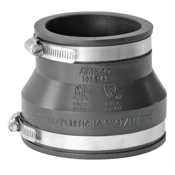 Made of a tough elastomeric PVC compound that meets the requirements of ASTM No. D5926 are resistant to chemicals ultraviolet rays fungus growth and normal sewer gases. Stainless steel clamps are corrosion-resistant and rust-proof. For use in sewer and drain water and vent piping. Clay to Cast iron or plastic. Maximum working pressure 4.3 P.S.I. (29.6 kPa); Maximum operating temperature: 140 deg. F. nonconsistent. A the inside diameter (I.D.) of side No. 1. B the inside diameter (I.D.) of side No. 2. C the length of the actual coupling end to end.