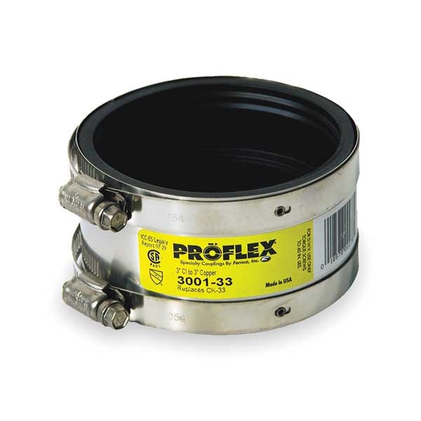 Shielded Transition Coupling, For Nominal Pipe Size 3 in, Neoprene, 3 in, 3 3/8 in, 3 3/4 in, Female, 3 in, 3 1/16 in, 3 3/4 in, Female, 2 1/8 in Overall Length