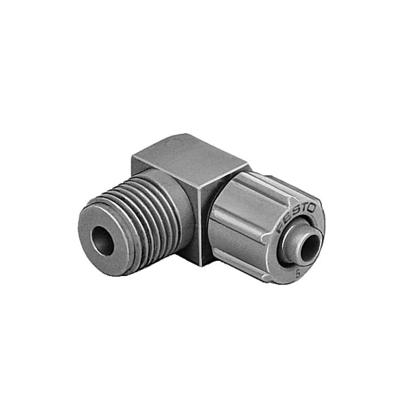 Elbow Quick Connector Gck-1/8-Pk-4-Ku Polymeric Design. Nominal Size=2,9 Mm, Assembly Position=Any, Pneumatic Connection, Port 1=Male Thread R1/8, Pneumatic Connection, Port 2=For Barbed Connector Internal Diameter 4 Mm With Nut, Materials Note=(* Free Of Copper And Ptfe, * Conforms To Rohs)