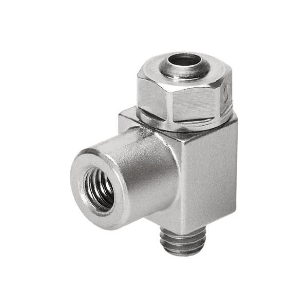 Flow Control Valve Grlo-M3 Without Non-Return Function, With Swivel Joint. Valve Function=Throttle Function, Pneumatic Connection, Port 1=M3, Pneumatic Connection, Port 2=M3, Adjusting Element=Slotted Head Screw, Mounting Type=Threaded