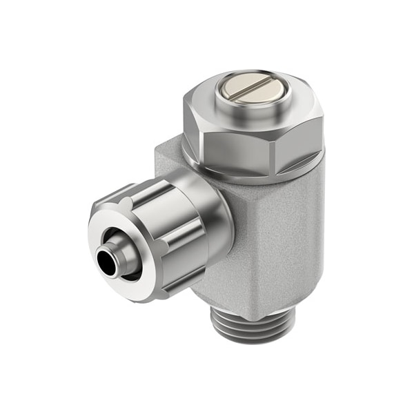 One-Way Flow Control Valve Grlz-1/8-Pk-4-B For Supply Air Flow Control, With Swivel Joint. Valve Function=One-Way Flow Control Function For Supply Air, Pneumatic Connection, Port 1=Pk-4 With Sleeve Nut, Pneumatic Connection, Port 2=G1/8, Adjusting Element=Slotted Head Screw, Mounting Type=Threaded