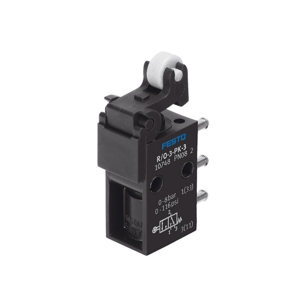 Roller Lever Valve R/O-3-Pk-3 With Barbed Fitting Connection For Tubing Nd 3 Mm. Depending On The Choice Of Connections, Normally-Open Or Normally-Closed Function. Valve Function=3/2 Open/Closed, Monostable, Type Of Actuation=Mechanical, Standard Nominal Flow Rate=80 L/Min, Operating Pressure=0 - 8 Bar, Design Structure=Piston Seat