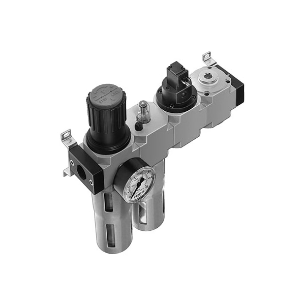 Service Unit Frc-1/8-D-Mini-Ke Consisting Of Filter Regulator, Lubricator, On/Off Valve With Solenoid Coil 24 V Dc Without Socket, And Pressure Build-Up Valve With Mounting Brackets. With Manual Condensate Drain And Metal Bowl Guard. Size=Mini, Series=D, Actuator Lock=Rotary Knob With Lock, Assembly Position=Vertical +/- 5°, Grade Of Filtration=40 μm