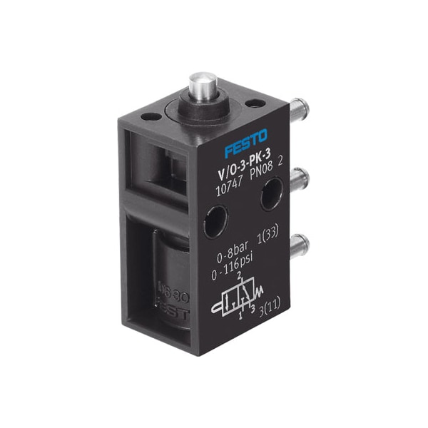Stem Actuated Valve V/O-3-Pk-3 With Barbed Fitting Connection For 3Mm Id Tubing. Valve Function=3/2 Open/Closed, Monostable, Type Of Actuation=Mechanical, Standard Nominal Flow Rate=80 L/Min, Operating Pressure=0 - 8 Bar, Design Structure=Piston Seat
