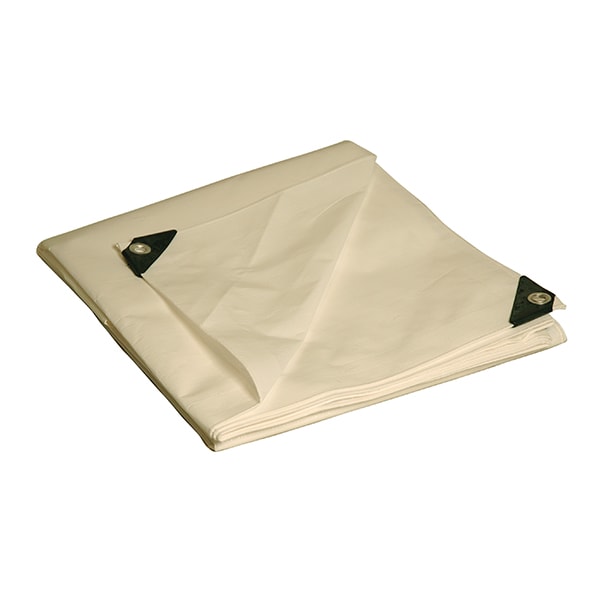This super heavy duty whit polyethylene tarp is a full finished size opposed to other cut size tarps. It is 5.5oz./sq.yrd., 14 X 14 cross weave, laminated on both sides, and UV treated for maximum weatherproofing and tear resistance. This tarp has frommets every 18 inches and plastic cap reinforced corners.