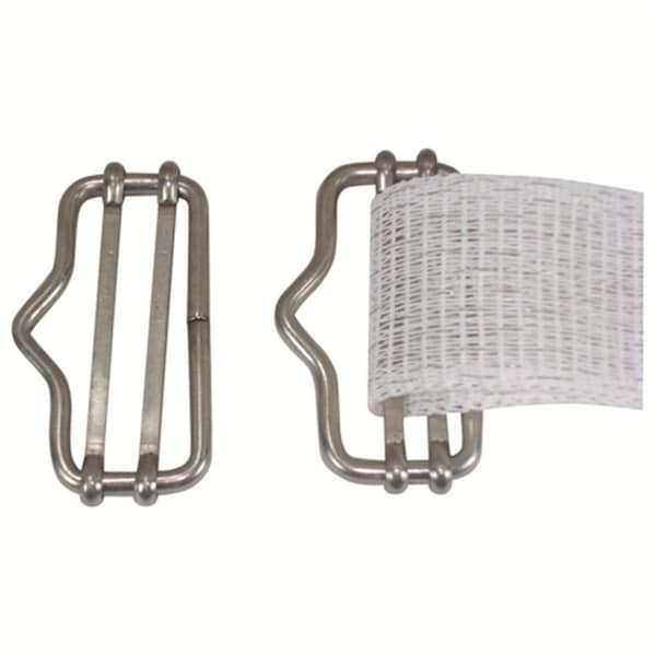This device is used to connect two 2 in. or 1.5 in. polytapes together or can be used for the end of a run. Features Used to end 1.5 in. or 2 in. polytape to a connector Used to make your own gates with 1.5 in. or 2 in. tape and gate handles Connector type - Polytape Connector Material - Stainless Steel Primary Color - Silver Dimension - 5 x 4 x 2 in. Item Weight - 0.2 lbs.