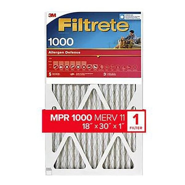 Filtrete Air Filter, NonElectrostatic, Pleated, MPR Rating 1000, MERV Rating 11, Filter Media Fiberglass, Frame Material Polypropylene, 18 in L, 30 in W, 1 in Thick