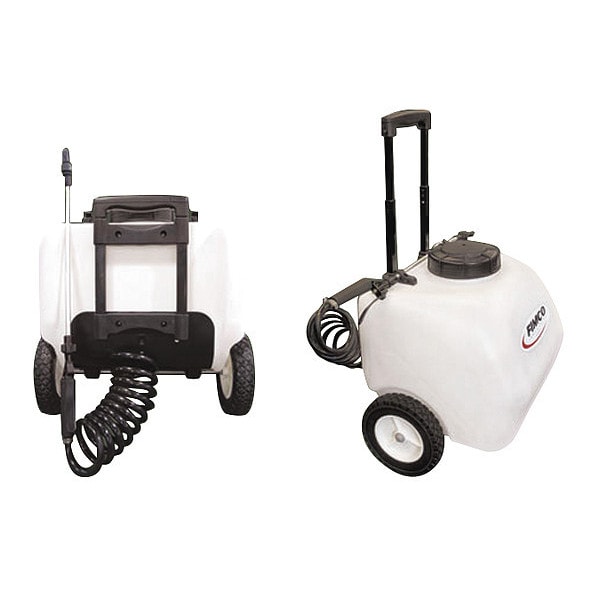 The FIMCO 8 Gallon Wheeled Spot Sprayer is ideal for small scale liquid pest control application in confined areas. The UV resistant, molded polymer tank sits on 8 inch wheels with a collapsible handle. This model lawn and garden sprayer features a 1.2 GPM Diaphragm Pump with 12 Volt rechargeable battery. The Lever Grip Spray Wand has an adjustable spray pattern with poly tip which adjusts from a stream to a cone and distributes up to 25 feet for horizontal spray, 15 feet of vertical spray and comes with 15 feet of coiled hose. This wheeled spot sprayer is the best sprayer for urban settings to control weeds, insects and diseases in bushes, hedges, and infested spots in lawns, flower gardens and parks along with pest control in buildings.