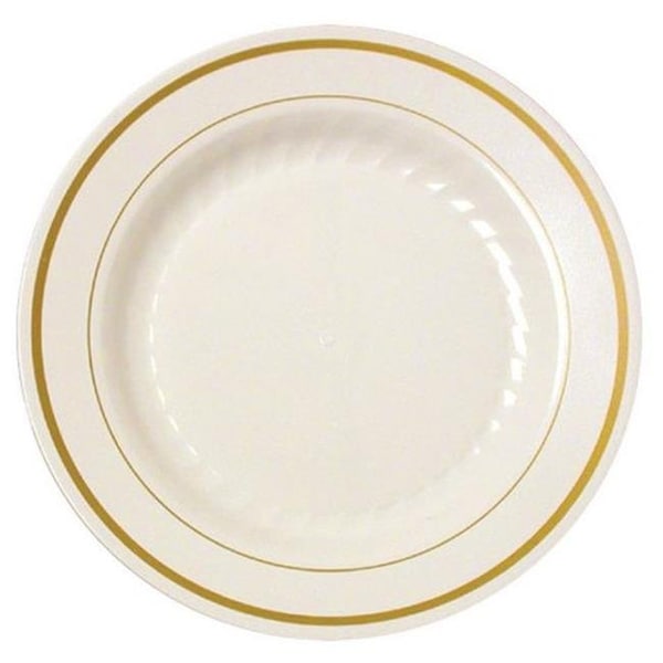 Fineline Settings offers a comprehensive assortment of plastic party and catering tableware. Their designs range from classic to contemporary, and the products establish tomorrow’s trends in today’s market. A decade of experience in the disposable tableware industry ensures they know just what the customer wants. Fineline Settings standards are set high. The commitment to being at the cutting edge of style and originality without ever compromising on quality or practicality is evident in every one of their products, and their mission is to enhance the most upscale event and please the most discriminating customer. Silver Splendor 507-BO: Bone/Gold 7"(Dia) Salad Plate made with Premium Disposable Plastic- 15/10-150Dimesnions: Length:14 Height:7.9 Width:7.9